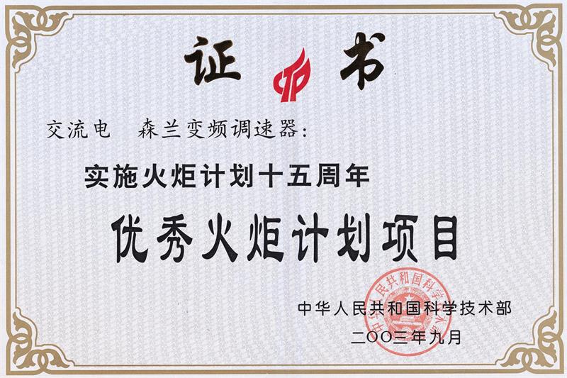 國家優(yōu)秀火炬計劃項(xiàng)目證書