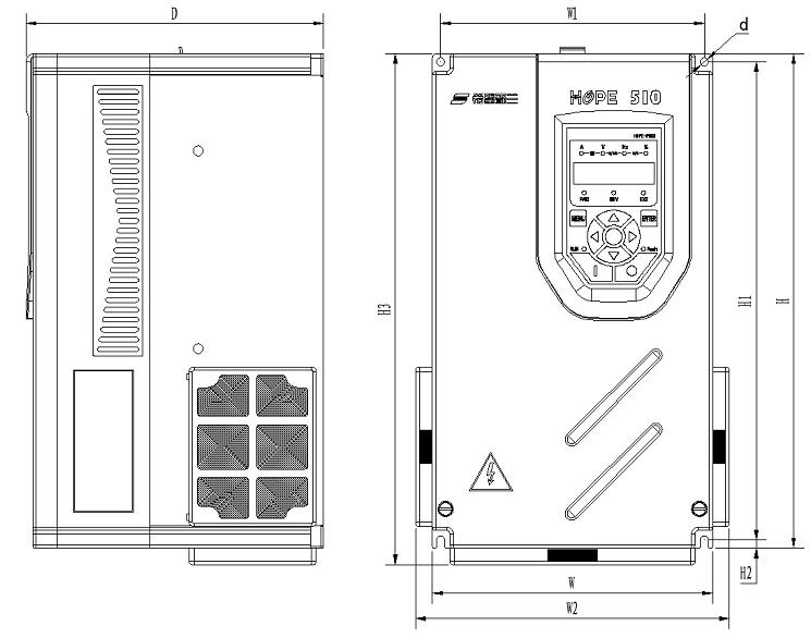 變頻器型號 | W (mm) | W1 (mm) | W2 (mm) | H (mm) | H1 (mm) | H2 (mm) | H3 (mm) | D (mm) | d (mm) |