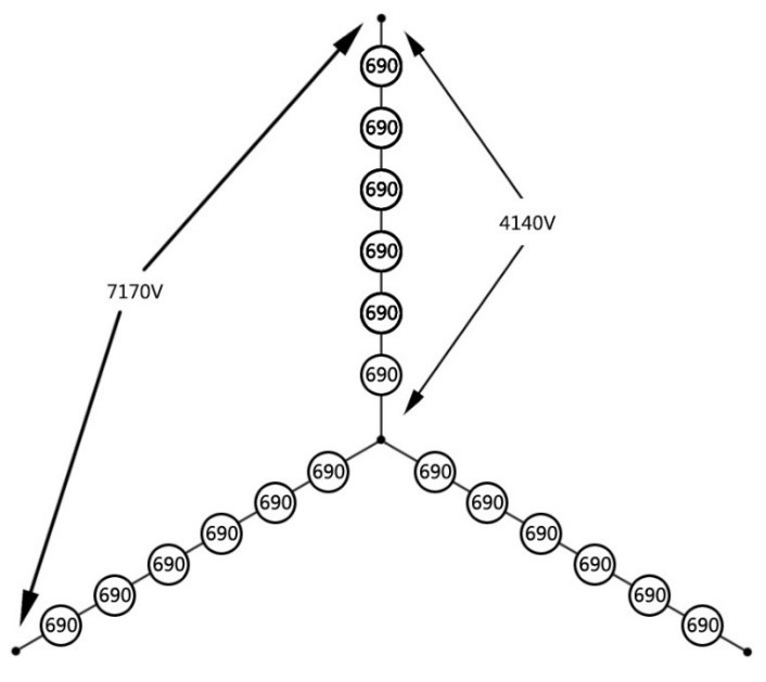 VFPS系列岸電電源系統(tǒng)采用功率單元串聯(lián)的形式,電壓疊加的原理類(lèi)似于“電池組疊加”技術(shù)。當(dāng)需要6.6kV輸出時(shí),每相串聯(lián)6個(gè)功率單元,每個(gè)功率單元輸出的交流有效值為634V,相電壓3810V,線電壓6600V。每個(gè)單元最高可以輸出690V,系統(tǒng)最高可以輸出7170V。