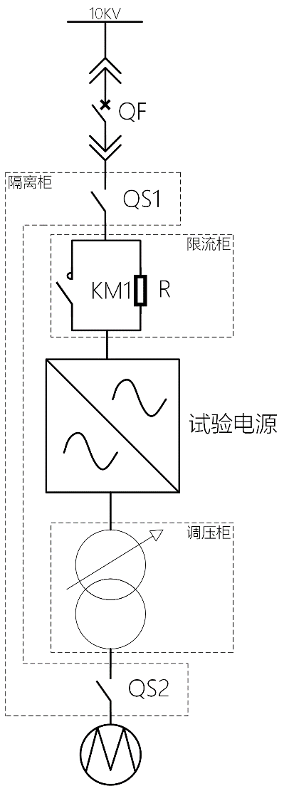 1)將高壓變頻試驗電源串聯(lián)在用戶現(xiàn)場的10KV與高壓電機之間即可。試驗電源的所有部件采用內(nèi)部連線,用戶只須連接380V/6KV/10KV輸入、高壓輸出、AC220V控制電源和控制信號線即可,方便快捷,操作簡單;