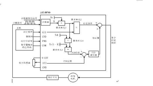 由代表生產(chǎn)紙線速度的主機(jī)(四缸或壓光機(jī)變頻器)運(yùn)行頻率和卷繞紙張的實(shí)時(shí)卷徑計(jì)算出相應(yīng)的從機(jī)(卷取機(jī))主給定頻率,以此作為前饋;同時(shí)用PID調(diào)節(jié)器控制紙張的張力PID輸出,對(duì)給定頻率進(jìn)行不斷修正,將修正后的頻率作為卷取電機(jī)的給定頻率。這種前饋和反饋共用的復(fù)合控制方法控制精度很高,很多張力控制專用的變頻器都使用了這種方法。而SB70G可以通過可編程模塊來編程實(shí)現(xiàn)這種控制,使用方便,方法靈活。系統(tǒng)控制框圖如下:
