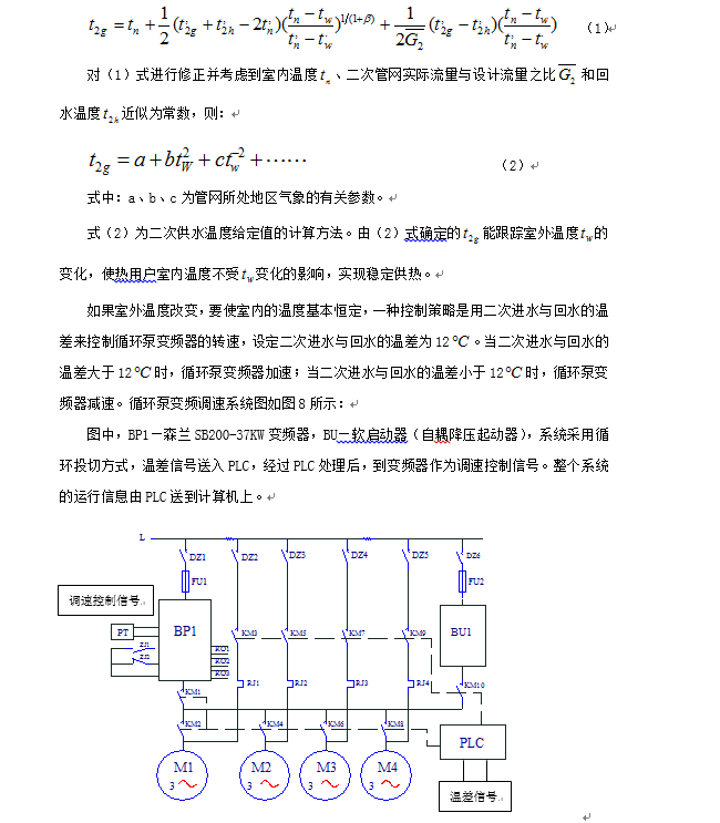 為節(jié)省能源,減少城市污染,充分利用火力發(fā)電廠蒸汽輪機發(fā)電后的余熱,在冬季對北方城市集中供熱。從發(fā)電廠送出來的熱水,到城市中的換熱站時,一次供水熱水溫度有90多度,經(jīng)過熱交換器后,一次回水熱水的溫度下降到60多度,然后再流回發(fā)電廠。送到城市居民家中的熱水,進入換熱站熱交換器的二次回水溫度有50多度,二次供水溫度60多度。陜西寶雞有許多這樣的換熱站,其中有一換熱站有四臺熱交換器,四臺37kW的管道泵組成的循環(huán)泵組,一臺3.7kW的補水泵。循環(huán)泵和補水泵采用人工開、關(guān)閥門控制流量,使管路的阻尼增大而造成電能浪費。