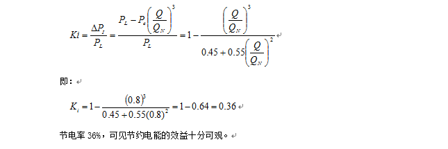 循環(huán)泵變頻調(diào)速后,所有的閥門開度最大,系統(tǒng)的阻力最小,當平均流量是設(shè)計流量的80%時,節(jié)電率可按GB12497《三相異步電動機經(jīng)濟運行》強制性國家標準實施監(jiān)督指南中的計算公式計算: