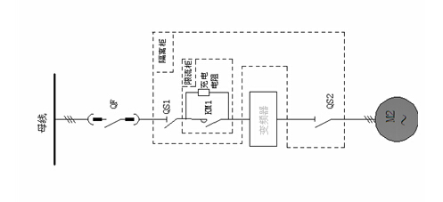 送水泵變頻改造系統(tǒng)包括三部分:隔離柜、限流柜、高壓變頻器。其中隔離柜由兩個(gè)隔離開(kāi)關(guān)組成,當(dāng)變頻器處于檢修和維護(hù)狀態(tài)時(shí),通過(guò)手動(dòng)操作分?jǐn)郠S1,QS2開(kāi)關(guān),確保檢修過(guò)程的安全性。當(dāng)需要對(duì)電機(jī)進(jìn)行絕緣耐壓試驗(yàn)時(shí),需要將QS2分?jǐn)啵囼?yàn)完畢,再手動(dòng)將QS2合閘。