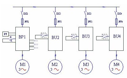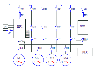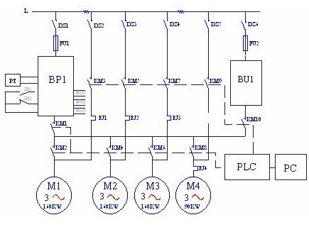 圖中:BP1—變頻器;BU2~BU4--軟起動(dòng)器,PT—壓力變送器。由圖一可見,變頻器連接在第一臺(tái)水泵電機(jī)上,需要加泵或減泵時(shí),由變頻器RO1~RO3端口輸出信號起動(dòng)或停止其他的水泵,這時(shí)水泵的起動(dòng)采用自耦降壓起動(dòng)裝置或軟起動(dòng)器。這種方案的特點(diǎn)是水泵電機(jī)不需要在變頻和工頻之間切換;第一臺(tái)水泵永遠(yuǎn)連接在變頻器上,沒有切換過程中的失壓現(xiàn)象;由于變頻泵以外的泵都有軟起動(dòng)器,所以不需要再做備用系統(tǒng),當(dāng)變頻器故障時(shí),可用軟起動(dòng)器手動(dòng)起動(dòng)M2~M4水泵,保證供水不致中斷;每臺(tái)電機(jī)都有起動(dòng)器,初始投資較大。另一種是“循環(huán)投切”方案,系統(tǒng)圖如圖二所示