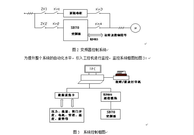 模擬量數(shù)據(jù)采集卡將壓力、流量、閥門開度、電機(jī)溫度和管道溫度等模擬信號轉(zhuǎn)換成12位的數(shù)字信號,每一路信號占用數(shù)據(jù)采集卡上一個模擬通道,互不影響,采樣周期為300ms。SB70變頻器支持RS485半雙工串行通訊方式,通過在工控機(jī)上用IP函數(shù)或VB的MSCDMM通訊控件編制串行通訊程序,即可實現(xiàn)工控機(jī)與變頻器之間的通訊,本系統(tǒng)用VB的通訊控件編制。將采集到的數(shù)據(jù)信號,經(jīng)實時分析處理后,通過組態(tài)王監(jiān)控畫面,監(jiān)測現(xiàn)場傳輸?shù)膶崟r數(shù)據(jù)和歷史數(shù)據(jù)及設(shè)備的運行狀況、歷史曲線的分析、實時報表、歷史報表的打印、聲光報警等。