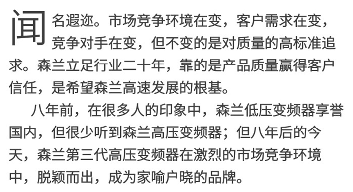希望森蘭作為節(jié)能環(huán)保、新能源、互聯(lián)網(wǎng)傳動控制及智能裝備領(lǐng)域的領(lǐng)軍企業(yè),擁有二十年的發(fā)展歷史,集研發(fā)、制造、系統(tǒng)集成、客戶服務(wù)為一體,產(chǎn)品涵蓋高低壓變頻控制系統(tǒng)、自動化生產(chǎn)線及機器人傳動控制,EPS電源、港口岸電、多/單晶硅電源等工業(yè)電源系統(tǒng)。為電力、建材、造紙、市政、有色冶金、石油石化、裝備制造與智能制造、港口與機場、軌道交通、新能源、充電集群等行業(yè)提供系統(tǒng)解決方案。秉承“卓越無境、希望無限”的經(jīng)營理念,二十年的專注和堅持,造就了希望森蘭卓越的品質(zhì),產(chǎn)品遍布中國、俄羅斯、印度、南非、巴西、意大利、丹麥、新加坡、印尼、馬來西亞、越南、土耳其等30余個國家和地區(qū)。