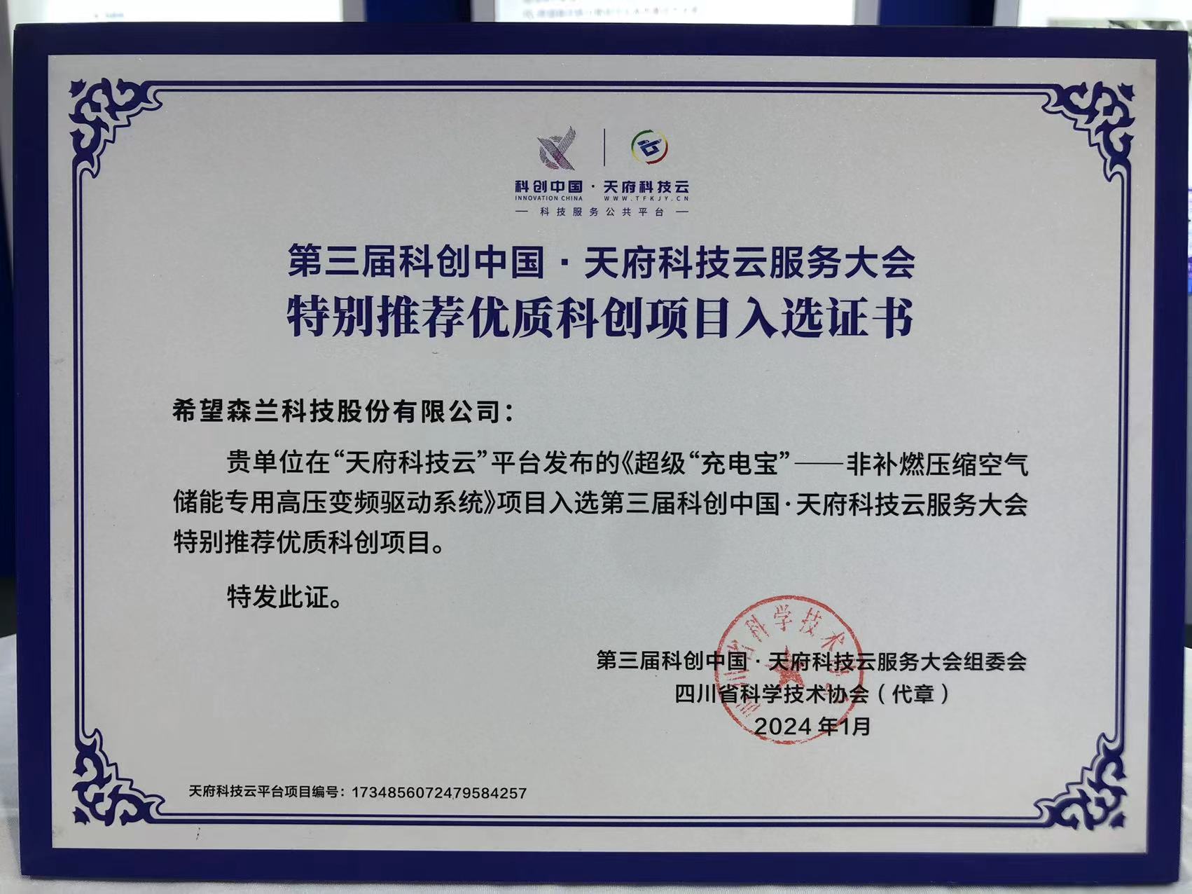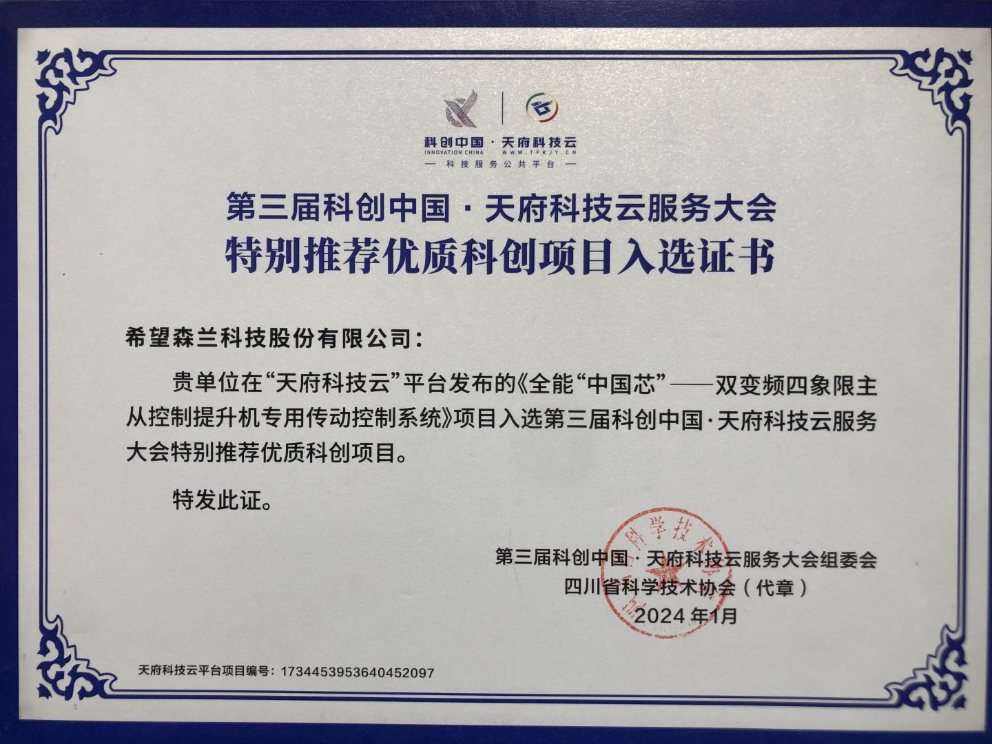 本屆大會(huì)面向大院大所大企業(yè)等征集到科創(chuàng)項(xiàng)目8700個(gè),希望森蘭科技股份有限公司作為國內(nèi)專業(yè)從事傳動(dòng)控制技術(shù)研究的領(lǐng)軍企業(yè),憑借硬核解決方案成功吸引了大會(huì)的關(guān)注。不僅被選為本屆重大高新技術(shù)待推廣項(xiàng)目,還榮獲了“特別推薦優(yōu)質(zhì)科創(chuàng)項(xiàng)目”獎(jiǎng)項(xiàng)。