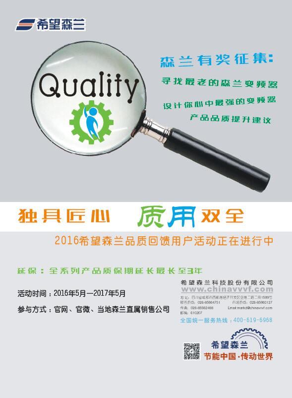 作為國內(nèi)變頻器行業(yè)領(lǐng)軍企業(yè)的希望森蘭科技股份有限公司(以下簡稱“希望森蘭”),在今年的5月份重磅推出了主題為“獨具匠心,質(zhì)用雙全”的品質(zhì)提升回饋活動,目前活動正在火熱進行中。